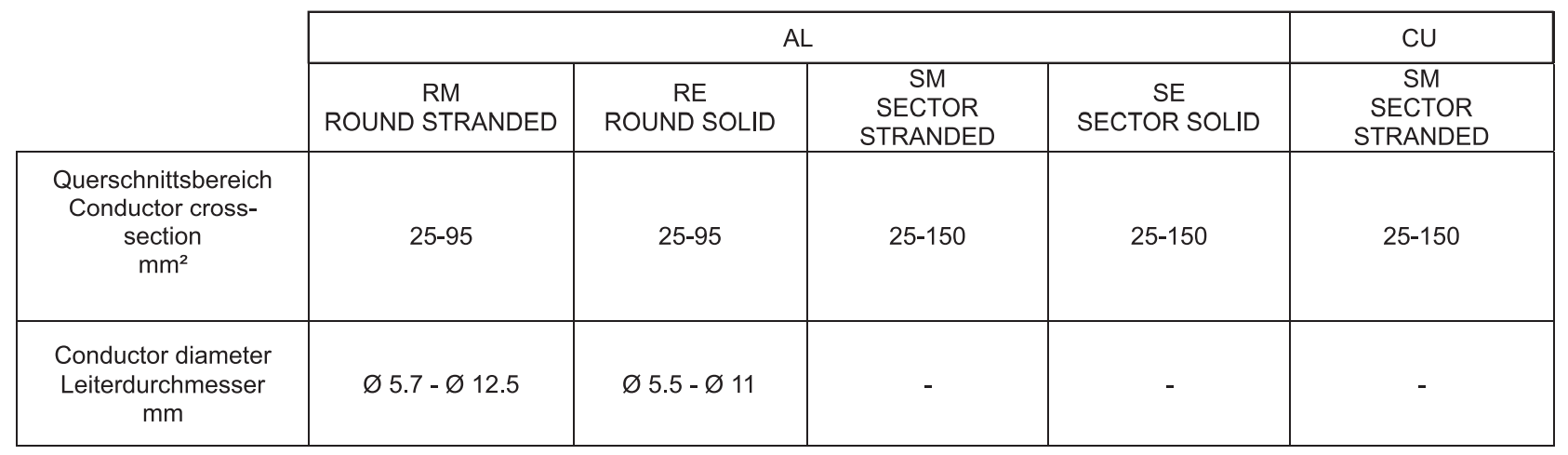 • Suitable for solid sectorial aluminium or copper conductors.